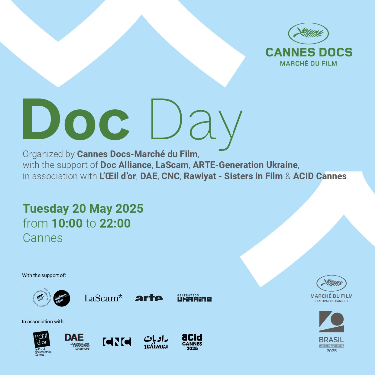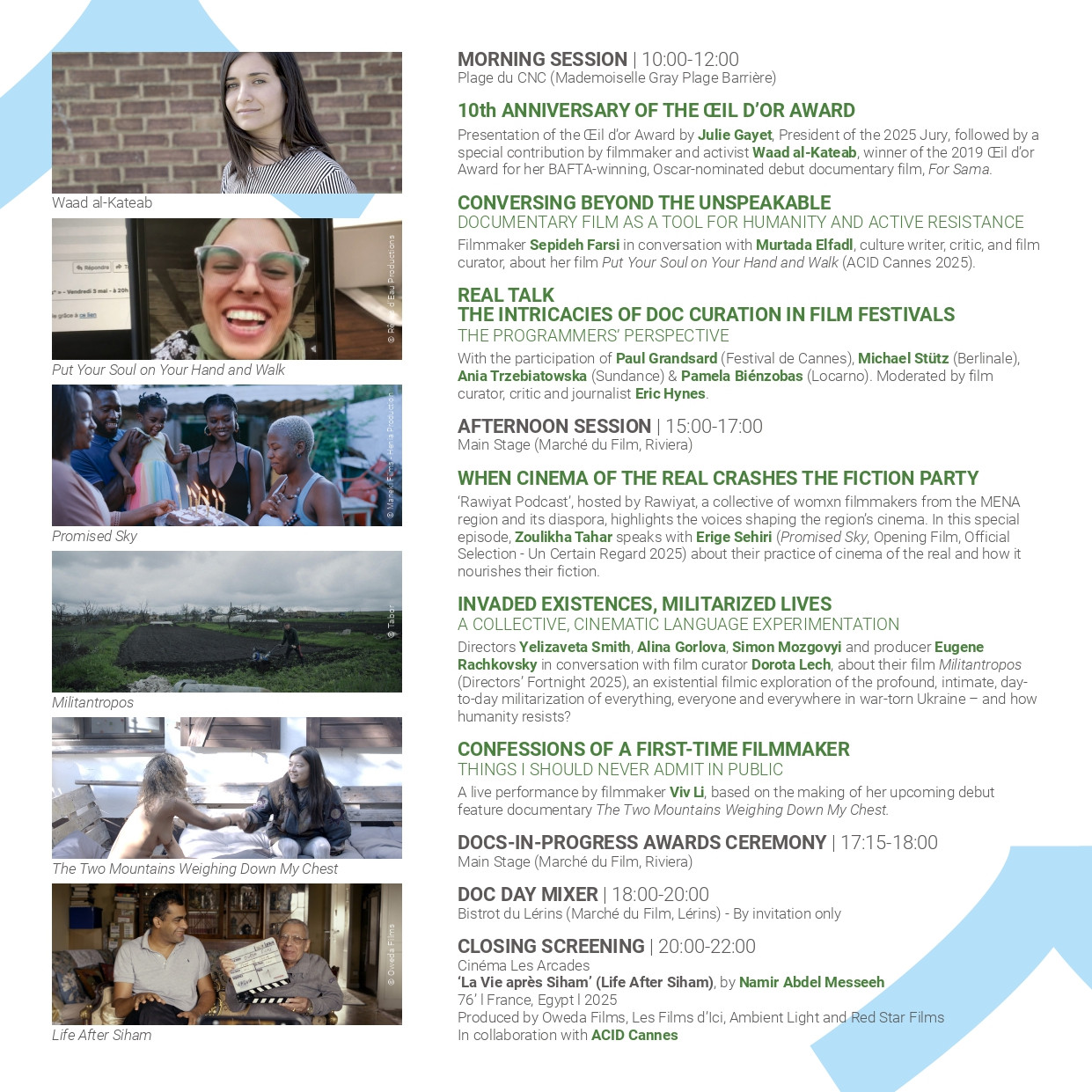 Doc Day propose une programmation soigneusement sélectionnée de conférences principales, masterclasses et tables rondes avec les réalisateurs et professionnels du documentaire les plus inspirants du moment, suivie de la cérémonie des Docs-in-Progress Awards et de notre Doc Day Mixer — un cocktail festif et rempli d’amour conçu pour rassembler toute la communauté documentaire à Cannes.