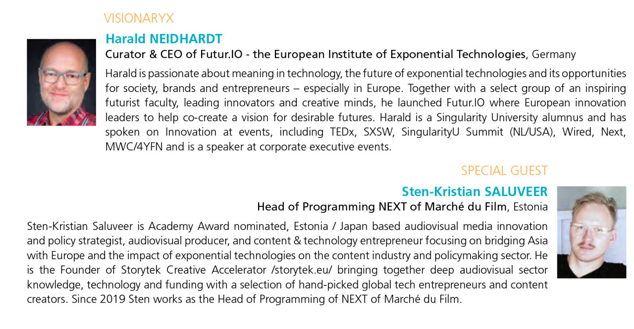 Over the last decades, films have inspired new ways of life, from imagining a better future and society, creating new forms of art, music and self-expression, or building new technologies from flying cars to 3D printers and facial recognition. We now live with exponential, previously unimaginable technologies at our fingertips… so who knows what the future will look like in the next decades? Futur/io – the European Institute of Exponential Technologies takes a stand against dystopian futures by inviting and creating a community of disruptive minds – from scientists, tech leader and filmmakers worldwide to create and share their visions of a desirable future. Join Harald Neidhardt, the Founder & CEO Futur.io to explore the visions and learnings, developed together with world class CxO’s, futurists and storytellers though Futur.Io’s educational program of exponential growth and desirable futures.